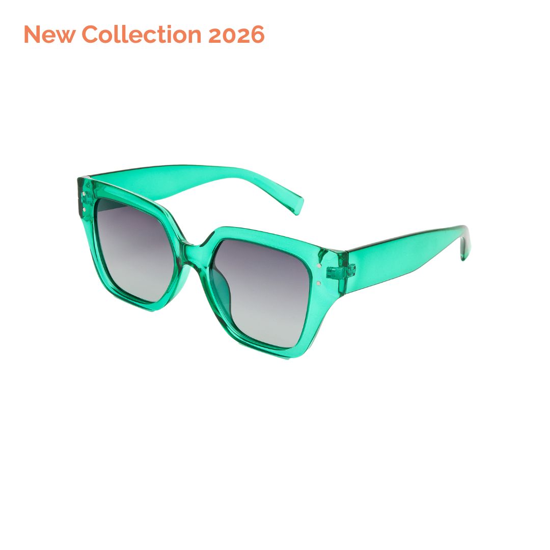 Destaca por su color verde translúcido. Su forma amplia y ligeramente angular enmarca bien el rostro y aporta un toque actual y moderno.