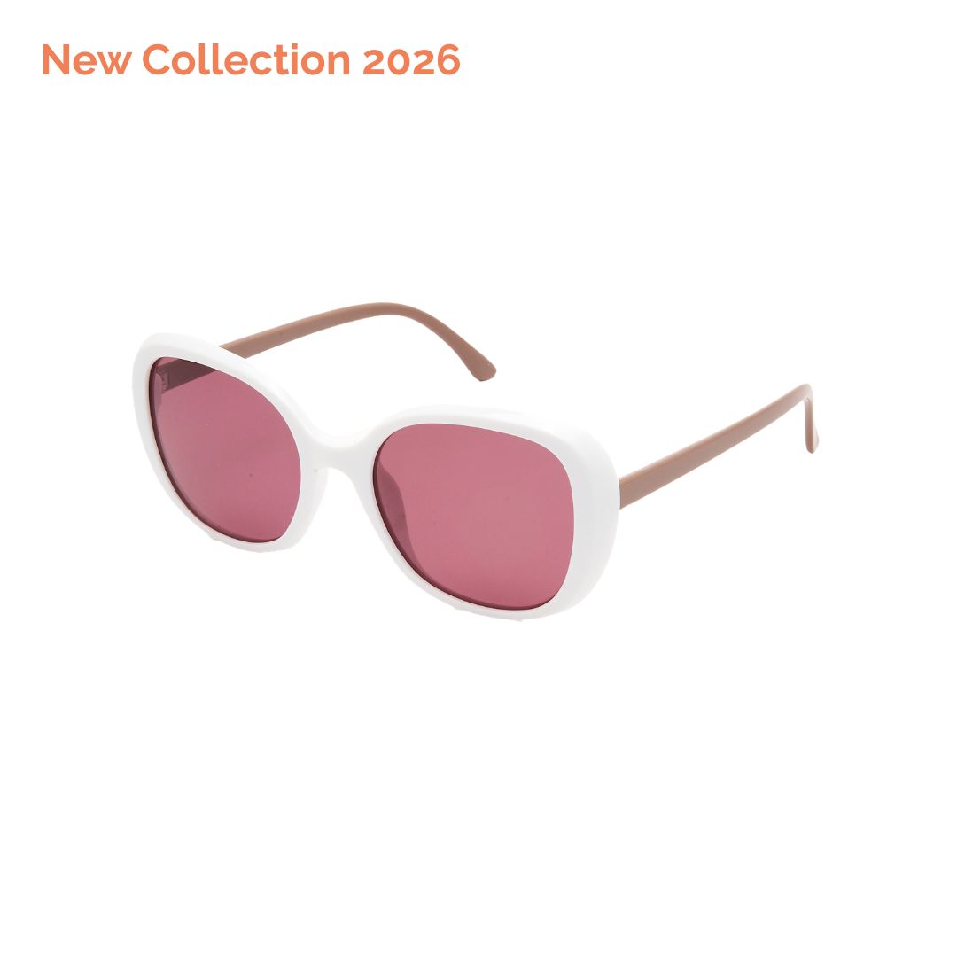 Combina una montura en blanco sólido con lentes en tono rosado, creando un contraste suave pero llamativo. Su forma redondeada con ligera caída aporta un aire más relajado y diferente.